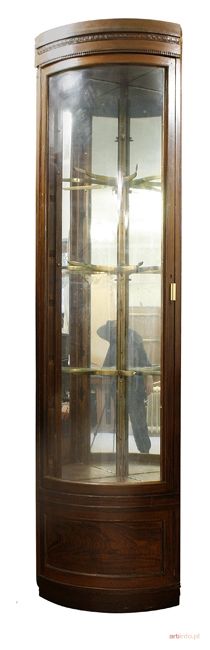 o wypukłej konstrukcji fornirowanej dębiną. Plecy mebla wyścielone lustrem. Bardzo interesujące podpórki pod szyby szklane wykonane z mosiądzu. Drzwi witryny wyposażone w giętą szybę. Najprawdopodobniej mebel wykonany na zamówienie z przeznaczeniem do przechowywania precjozów, dlatego rzadki.