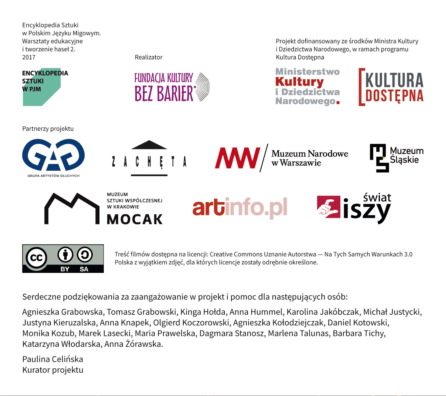 Celem jest tworzenie bazy wiedzy na temat sztuki w Polskim Języku Migowym tak, aby niesłyszący mieli łatwy dostęp do zagadnień, które mogą być dla niech trudne i zawiłe w języku polskim (definicje słownikowe, specjalistyczna terminologia). Projekt daje szansę niesłyszącym osobom (młodzieży, ale też dorosłym) na zdobycie wiedzy i podniesienie kompetencji kulturowych. Wypełnia poważną lukę w materiałach edukacyjnych w PJM. Powstają zwięzłe definicje podstawowych pojęć dotyczących sztuki tłumaczone na PJM. Na liście dotychczas nagranych krótkich filmów-definicji (prawie 150!) znalazły się między innymi tak podstawowe pojęcia jak: kompozycja, fotografia, negatyw, faktura, ceramika, grafika, kolaż, rzeźba i inne. Ale też nieco bardziej skomplikowane jak np.: art-brut, po-sztuka, hipperrealizm, unizm, neoplastycyzm, czy podstawowe kierunki, tendencje i zjawiska w sztuce: gotyk, renesans, barok, rokoko, secesja, historyzm, kubizm, konstruktywizm. Jak i sylwetki twórców: Katarzyny Kobro i Władysława Strzemińskiego. Encyklopedia została zainicjowana przez Zachętę - Narodową Galerię Sztuki w 2014 roku, w ścisłej współpracy z GAG. Powstało wówczas ponad 40 haseł, sfinansowanych w całości przez Zachętę. W 2016 roku nagrane zostały kolejne we współpracy z GAG, Zachętą - Narodową Galerią Sztuki, Muzeum Narodowym w Warszawie i Muzeum Sztuki w Łodzi z dotacji Ministra Kultury i Dziedzictwa Narodowego, z programu Kultura Dostępna. Realizatorem była inicjatorka encyklopedii Paulina Celińska. W 2016 roku pracy nad encyklopedią towarzyszyły warsztaty prowadzone przez osobę głuchą - Daniela Kotowskiego. W 2017 roku, dzięki dotacji MKiDN, projekt był kontynuowany przez Fundację Kultury bez Barier z udziałem Muzeum Narodowego w Warszawie, Zachęty - Narodowej Galerii Sztuki oraz Muzeum Sztuki Współczesnej w Krakowie MOCAK, Muzeum Śląskiego w Katowicach oraz Artinfo.pl, pod patronatem Świata Ciszy. Warsztaty poprowadzili: Daniel Kotowski i Marek Lasecki w Warszawie, Kinga Hołda i Michał Justycki w Katowicach, Monika Kozub w Krakowie. Realizatorem projektu Encyklopedia Sztuki w Polskim Języku Migowym (PJM) Warsztaty edukacyjne i tworzenie haseł 2 w 2017 roku była Fundacja Kultury bez Barier. Projekt dofinansowany ze środków Ministra Kultury i Dziedzictwa Narodowego, w ramach programu Kultura Dostępna.