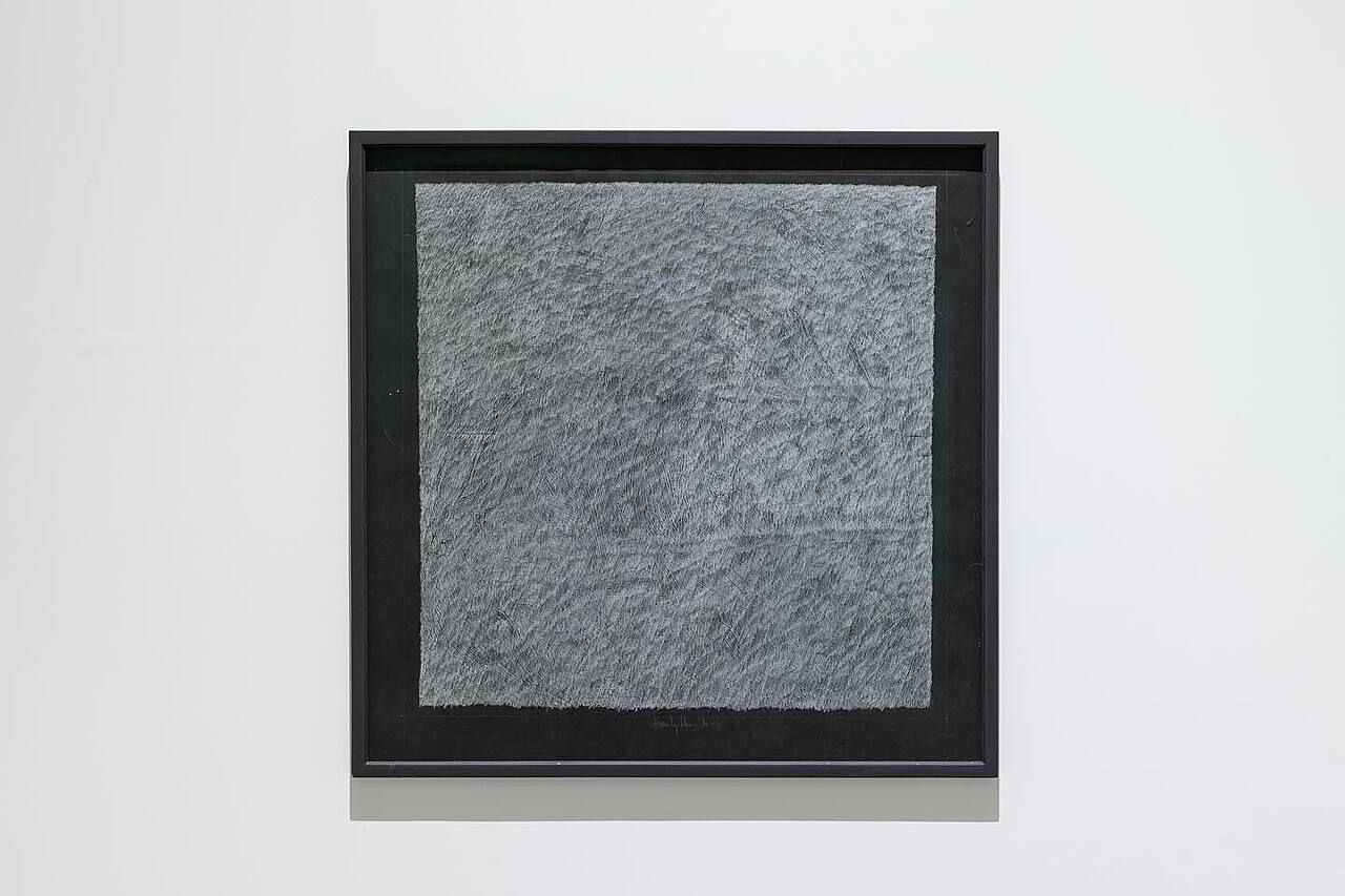 Ado Hamelryck (1941 Halle - 2024 Genk) był artystą wizualnym, którego praktyka koncentrowała się na spektrum ciemnych tonów. Wybór ten stanowił istotny element jego poszukiwań nieskażonego obrazu i formalnej doskonałości. Hamelryck wypracował całkowicie własny język – zarówno w wymiarze materialnym, jak i symbolicznym. Aplikacja czarnej farby, tuszu czy materii odbywała się poprzez powtarzalne, rytmiczne i kontemplacyjne gesty. Bezsensowne znaki czy litery wypełniały przestrzeń, by dzięki długotrwałemu procesowi działań wyłonił się obraz ostateczny – dzieło, w którym to, co pozornie pozbawione znaczenia, stawało się nośnikiem sensu.