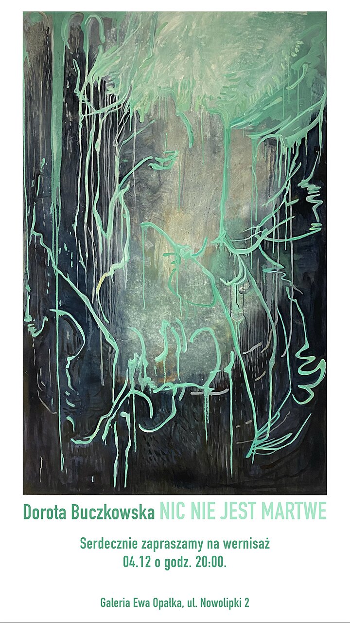 Rzeźbom towarzyszą obrazy - Buczkowska prezentuje najnowszy prace, które noszą charakterystyczny rys jej organicznego podejścia. Abstrakcje, na które patrzymy przypominają żywe tkanki obserwowane pod mikroskopem. Płótna żyją swoim wewnętrznym życiem, często pozornie ukazując ciemność i pustkę. Jest tu struktura, jest i ciało, które oddycha, ciągła przemiana, transformacja. Znów oddech, zawieszenie pomiędzy, forma przetrwania.