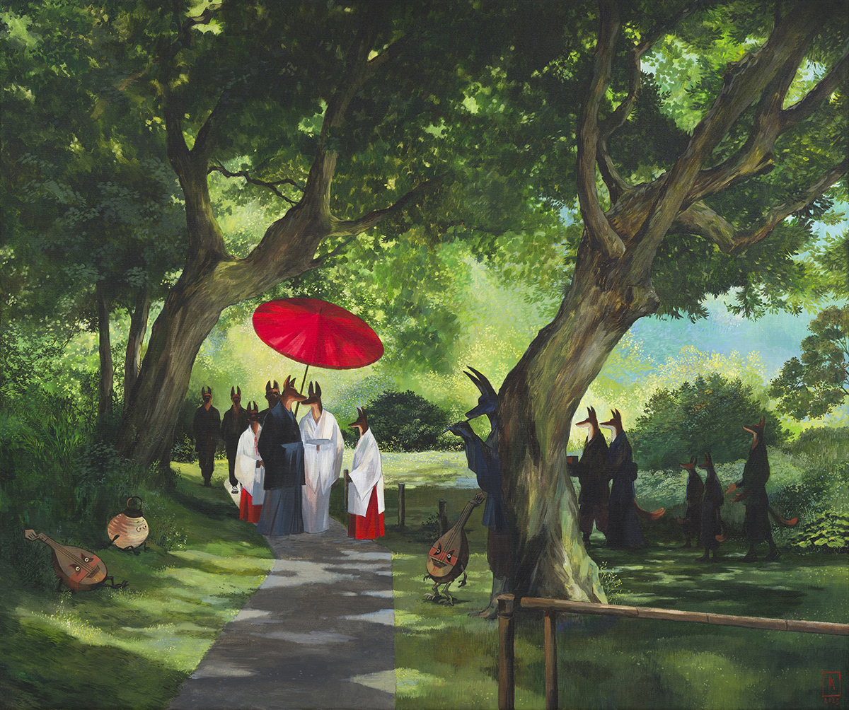 Malarka mówi o tej współpracy: “Jej fotograficzne notatki z podróży posłużyły mi do pokazania świata, w którym tajemnica funkcjonuje obok codziennego życia. Yōkai, stworzenia pochodzące z ludowych wierzeń i tradycji Japonii, spotykają Anubisa - wiecznego podróżnika pomiędzy światem żywych i zmarłych, rodem ze starożytnego Egiptu. Mamy więc na obrazach prezentowanych na wystawie nocny orszak lisów, ich wesele, psotne tanuki, koty z podwójnymi ogonami czy morskiego potwora umibozu.