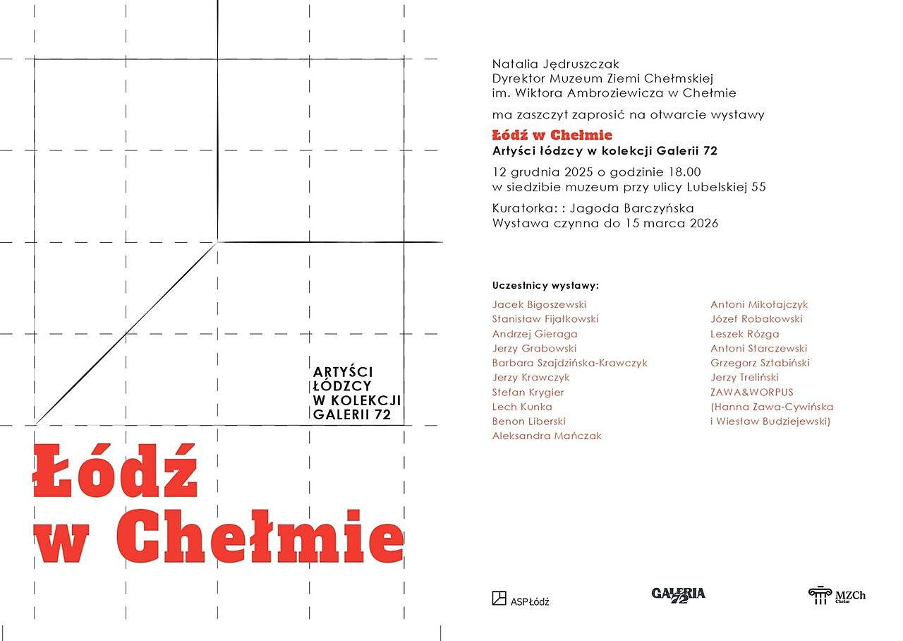 Na parterze pisząca te słowa przygotowała prezentację utworów artystów związanych ze środowiskiem łódzkim, których prace przynależą do zbiorów naszej chełmskiej Galerii 72. Prezentujemy 70 obiektów z zakresu malarstwa, reliefu, grafiki, rysunku i rzeźby, które wyszły spod ręki 16 autorów oraz dwojga artystów tworzących grupę ZAWA & WORPUS. Przedstawiane dzieła należą do tuzów polskiej sztuki powojennej, których w większości nie ma już wśród nas. Dwunastu wybitnych autorów, których gościły nasze muzealne progi, na przestrzeni ponad pięćdziesięcioletniej historii Galerii 72 opuściło nas na zawsze. Pozostały ich prace, które przemawiają do nas zarówno znajomą i rozpoznawalną formą figuracji, jak również utworami wyróżniającymi się scjentystyczną predylekcją, gdzie forma, światło, kolor, matematyczny ład, pozwalają na szukanie praw rządzących uniwersum. Pokazane prace zasiliły chełmska kolekcję drogą zakupów, darów, jak również są pokłosiem Międzynarodowych Plenerów dla Artystów Posługujących się Językiem Geometrii, które Muzeum organizowało corocznie w Latach 1985-2000 w Okunince nad Jeziorem Białym w pobliżu Włodawy.