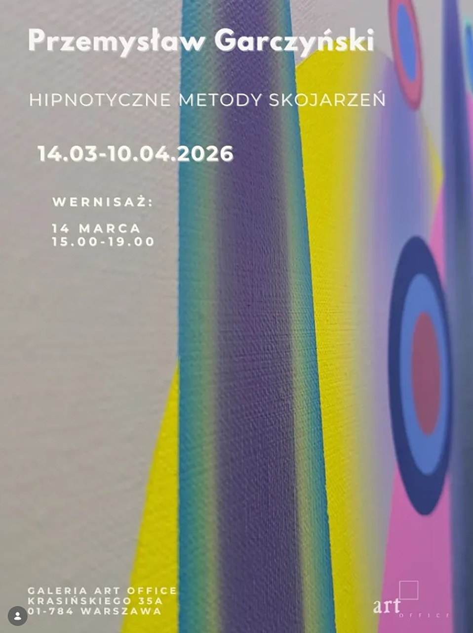 W przestrzeni Art Office zobaczycie 6 obiektów malarskich Przemysława Garczyńskiego, który w najnowszych realizacjach kontynuuje własną ścieżkę myślenia o figurze i abstrakcji. Na te hipnotyzujące kompozycje warto spojrzeć z perspektywy poszerzonej o doświadczenie ruchu. Poszczególne elementy obrazu - nawet kiedy wykonują zjawiskowe salto mortale - wciąż skutecznie utrzymują się w ryzach skali i perspektywy. Nie znajdziemy tu ani statycznych rozleniwień, ani porywczej histerii. To obietnica ruchu, którą Garczyński materializuje nieustannie poprzez zamazywanie granic i która sprawia, że obraz nie tyle przedstawia, co wydarza się w czasie patrzenia.