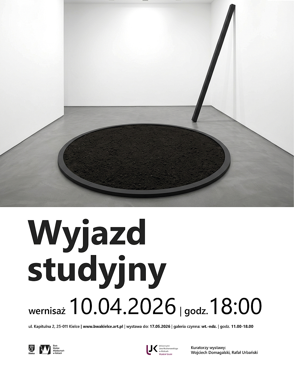 Od 10 kwietnia w Galerii Dolnej będzie można oglądać wystawę „Wyjazd studyjny”, prezentującą prace wykładowców i studentów Instytutu Sztuk Wizualnych UJK w Kielcach. Kuratorami wystawy są Wojciech Domagalski i Rafał Urbański. Ekspozycja będzie dostępna do 17 maja 2026 roku. Wystawa odnosi się do doświadczenia pracy twórczej rozwijanej w bezpośrednim kontakcie z otoczeniem, wspólnotą i zmieniającym się środowiskiem. Ekspozycja obejmuje malarstwo, rzeźbę, rysunek, grafikę, plakat, instalacje site-specific, wideo oraz projekty intermedialne.